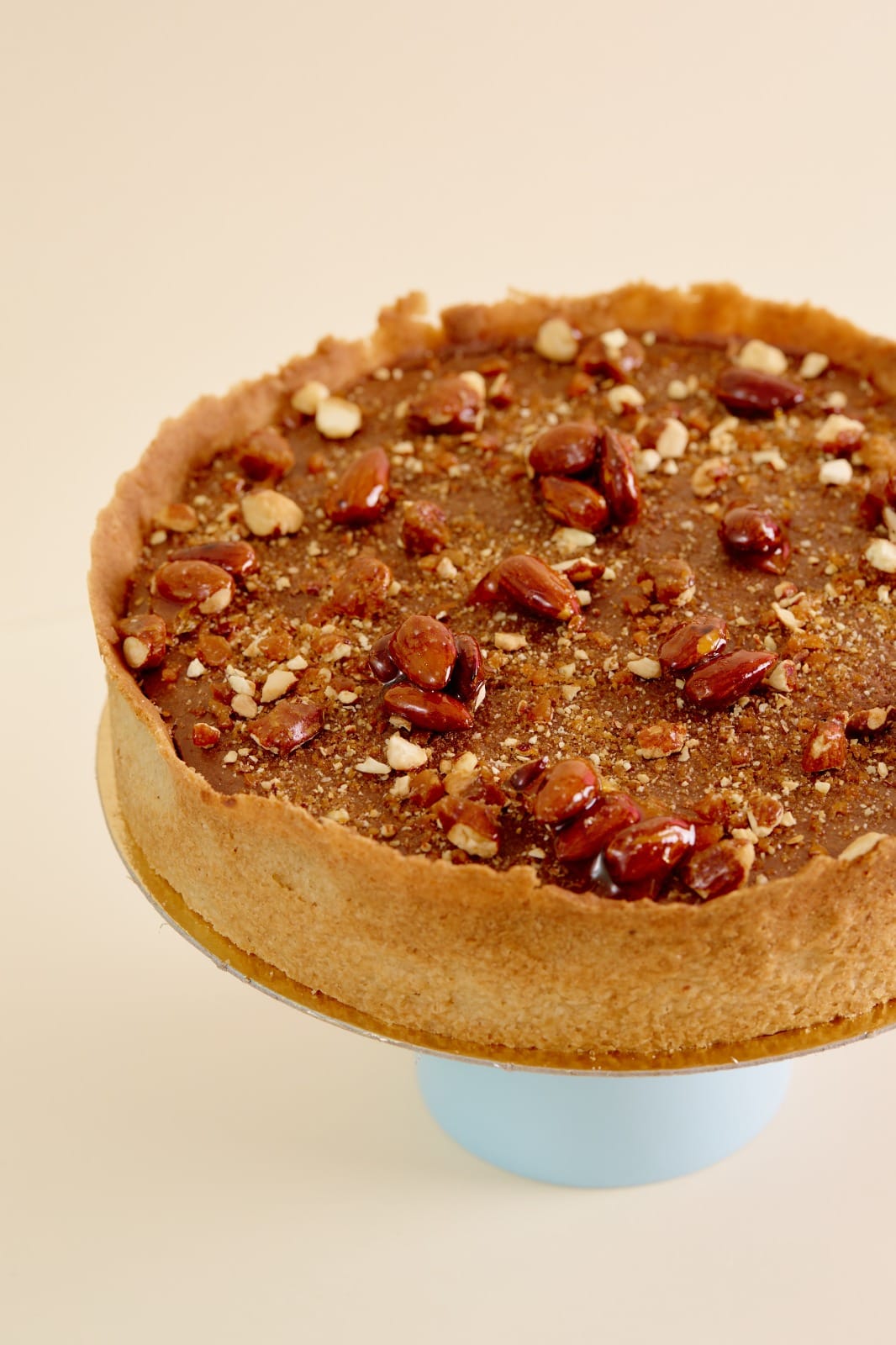 Massa sablée, mousse de chocolate ao leite, flor de sal e praliné de amêndoas.